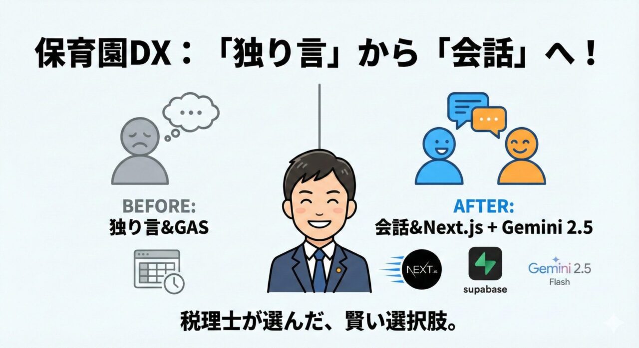 「スマホへの独り言」はツラい…。現場の悲鳴を聞いた税理士が、型落ちGemini 2.5で「会話型日報」を自作した話。業務効率化・開発日誌 【アプリ開発続編】「高機能」より「適材適所」。Gemini 2.5 Flashと脱GASで実現した、身の丈に合う最強の保育園DX。 自社開...ブログ -